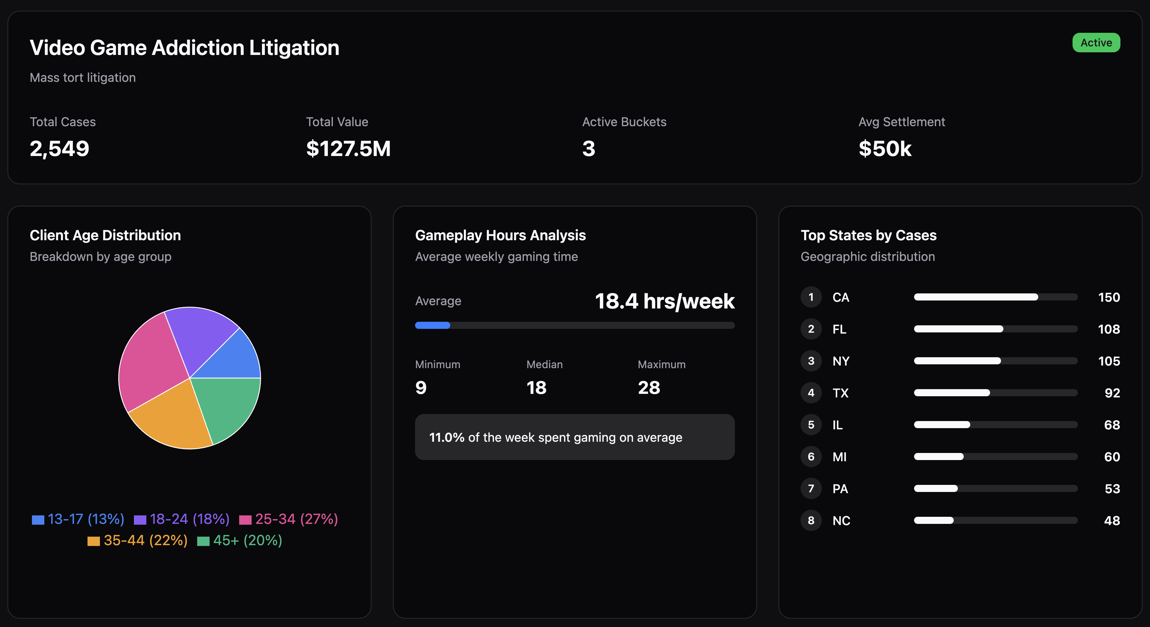 Explore active dockets filtered by litigation type, tier, geography, and case count. Full demographic data before you commit.